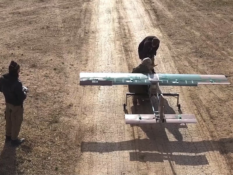 ISIS published a link to the 44-minute video on a private Telegram channel, the encrypted messaging app popular with the group. The video contains footage of several car or truck bomb attacks, known as VBIEDs, as well as segments showing off the group’s homemade weaponry, including anti-tank launchers, unmanned ground drones, and the larger fixed wing drone. According to analysts, most of the footage comes from around Mosul, Iraq, where ISIS is currently engaged in a months-long battle with coalition forces.