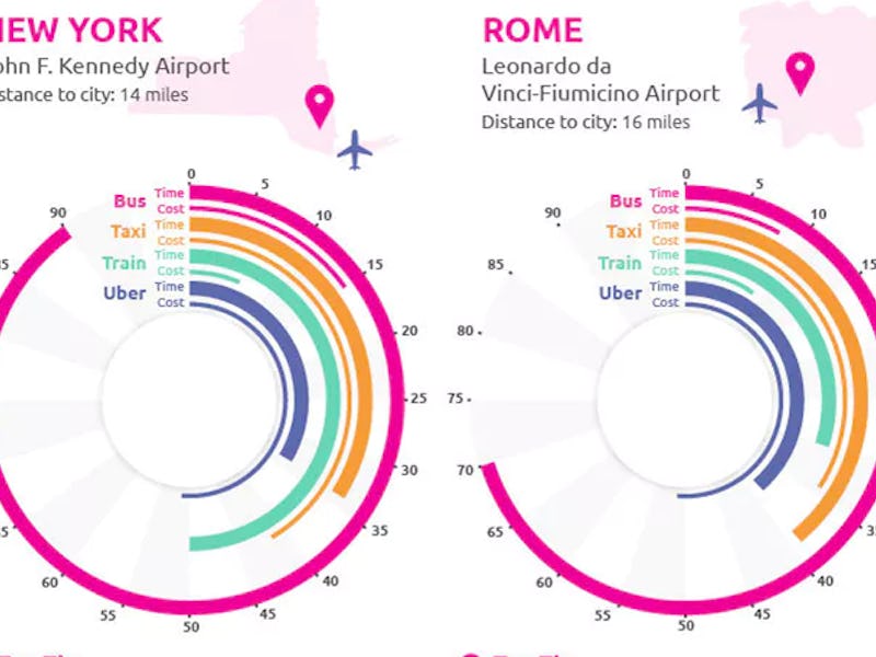 Uber may have its wheels firmly on the ground, but it’s had a big effect on how people travel by plane. A new infographic comparing time and costs associated with traveling from the airport to a city center reveals that the ride-hailing app, in many instances, is a tourist’s best option for getting around. With the company exploring autonomous cars and flying machines of its own, it could develop into an even more efficient transport method than today.