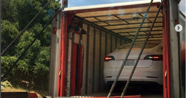 To get there, it looks like Tesla is loading the newborn Model 3s into box trucks and driving them up and down the California coast. Sugi Widjaja spotted the Model 3 getting unloaded from said truck along the highway, and snapped a few quick shots.