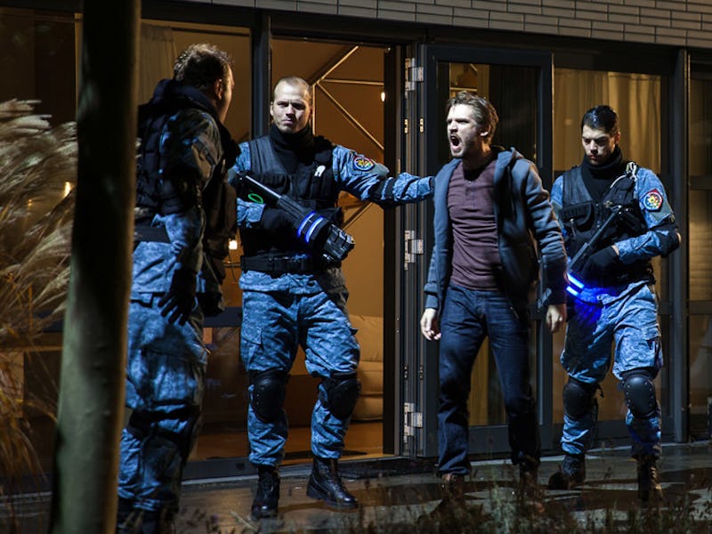 As Dread Central reported, Saban Films, the team behind Kill Switch, just released a new set of photos from the film that shows its varied locations and moods. A man staring dead-eyed into a camera while holding a black box fixed with a red circle, two mystery character supposedly from the parallel universe look harrowed, and Stevens reassures his worried-looking wife and son several times.