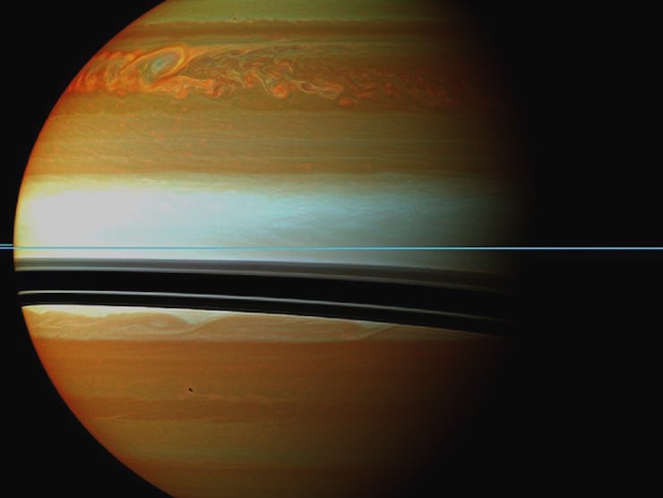 An image of Saturn taken by Cassini (NASA added some false colors to show "varying degrees of methane absorption.")