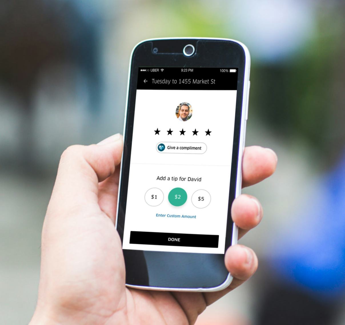 First, you’ll need to rate your trip (you can’t add a tip otherwise). Then you’ll be able to choose from a few preset amounts — they’re trying out $1, $2, and $5, so opting away from the traditional percentage model — or hit “enter custom amount” to type in a different number. Tap “done,” and you’ll be finished.