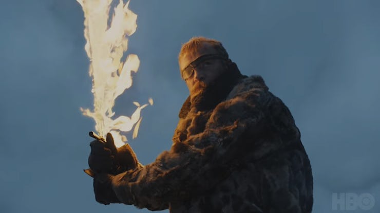 The new trailer for Game of Thrones Season 7 features a badass shot of a dude with an eyepatch wielding a flaming sword. A closer watch of the trailer reveals that this same man with a blazing weapon also appears later, standing by Jon Snow’s side. This imagery isn’t just meant to look cool — it’s essential to the story.