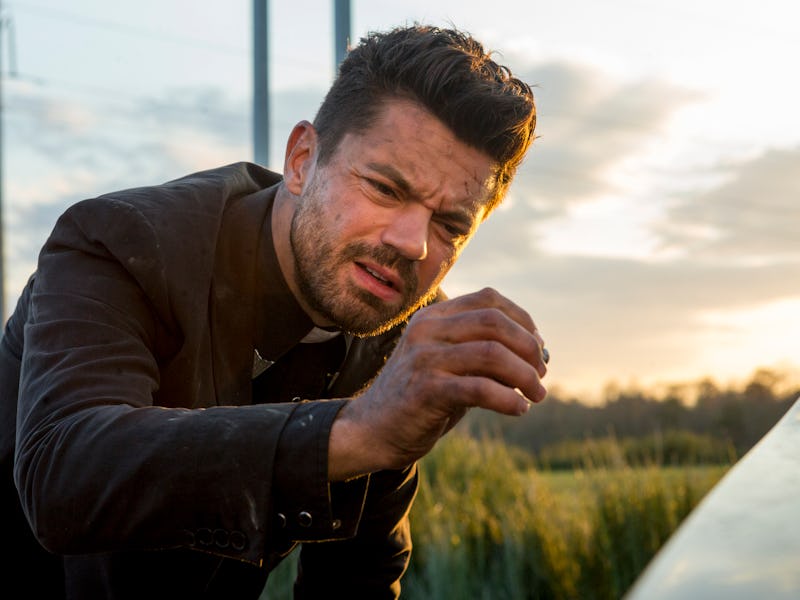 It’s been a long year since Preacher held Sunday service on AMC, but the Season 2 premiere “On the Road” begins just after where the Season 1 finale left off. As Jesse (Dominic Cooper), Tulip (Ruth Negga), and Cassidy (Joseph Gilgun) finally embark on their journey across America to find God, the ruthless Saint of Killers (Graham McTavish) isn’t far behind, and “On the Road” ends with the Saint of Killers getting too close for comfort.