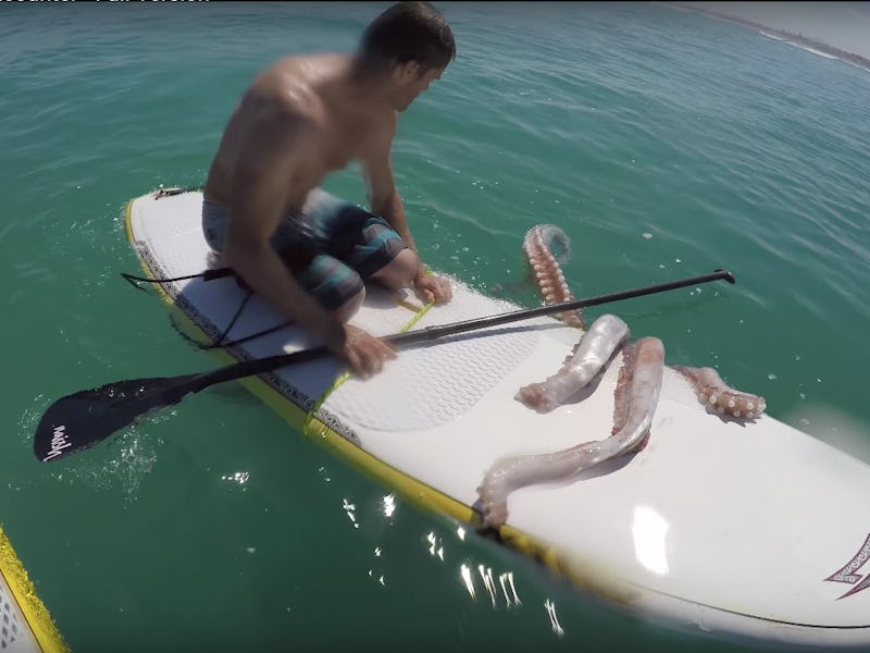 In a viral video, a paddleboarder wrangles with a giant squid off the western coast of South Africa. The squid limply reaches its tentacles around the board, causing its human passenger to jump ship. The incident, which occurred in March, was neither a rescue mission nor a gesture of friendship the paddleboarder, James Taylor, tells Earth Touch News Network.