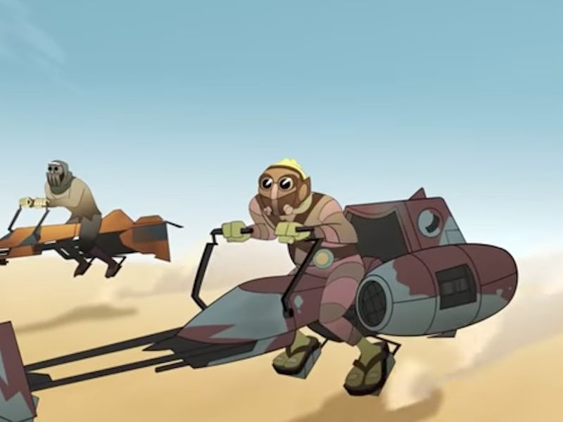 Picking up where the last short installment ended, the second episode of Forces of Destiny introduces some new bandits to the world of Jakku. This time, instead of a hungry monster, these guys seem like actual bounty hunters, complete with retro-Return of the Jedi-era speeder bikes.