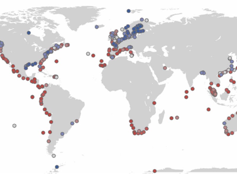 These maps show how quickly flooding rates will rise on global coasts. The first map is according to the old model, and the second represents the new one. Red dots indicate where a flood with a one percent chance of occurring in a given year today will have a 10 percent or greater chance of occurring by 2050.
