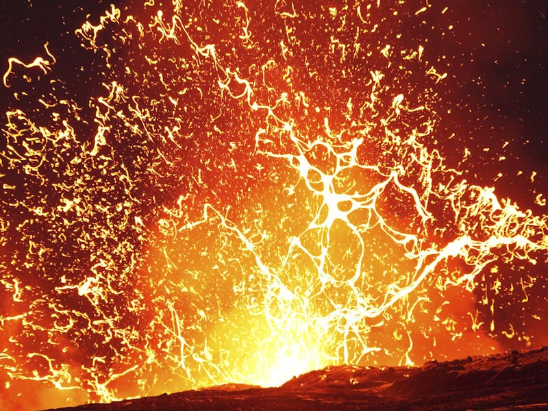 The image shown had an ocean in the background. This was a shot of Hawaii’s Kilauea volcano, which has been gently erupting since the early 1980s. Kilauea is one of the most active volcanoes on Earth, but this doesn’t mean it’s deadly (unless you get too close). Hawaiian volcanoes typify a volcano that gently gushes lava and builds land, rather than erupting explosively, like Mount St. Helens or Mt. Vesuvius, which blow up mountains and bury cities. But when Kilauea’s 1,500-degree lava meets the 75-degree Pacific Ocean, it can burst into smoke.