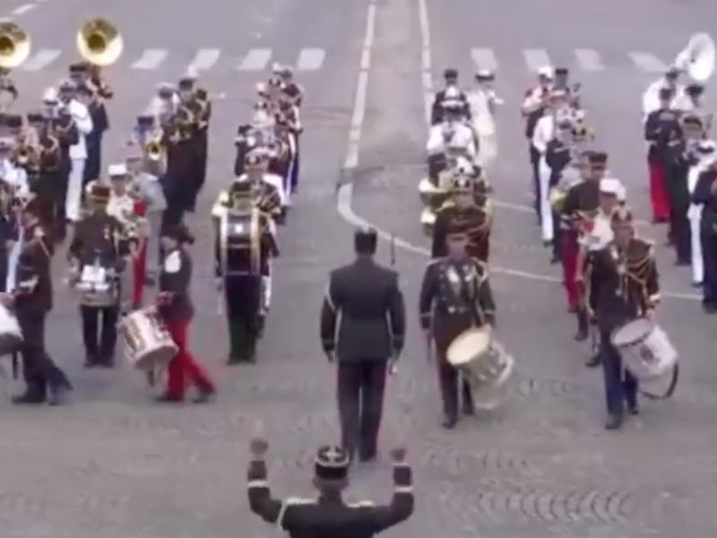 It seems like a surprising way to end such a grand parade, but in the video the commentators explain that this is a regular occurrence, and that French military orchestras tend to play renditions of modern songs. Following the medley, the band played “C’est la fête” by Michel Fugain.