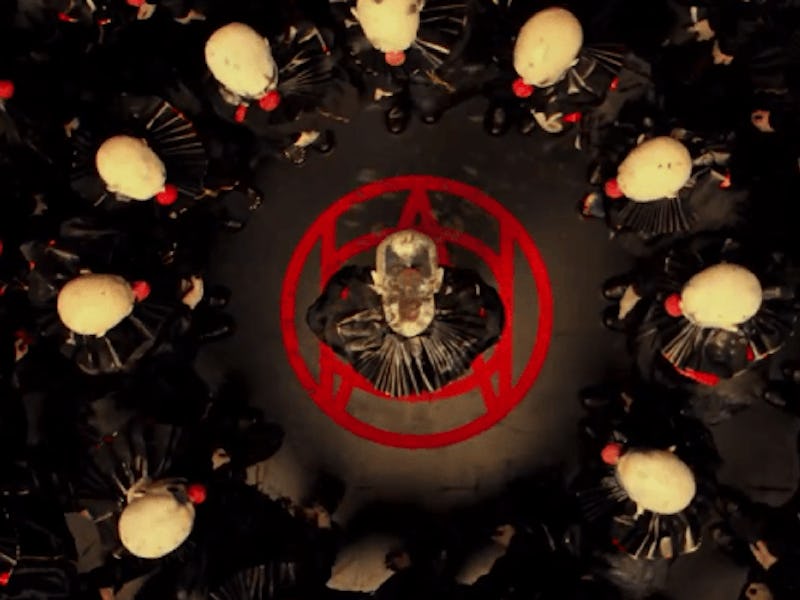 At a waterside event on Thursday night, Murphy and the FX team inundated viewers with a light show and a series of disturbing images projected onto the mist over the water of red, white, and blue-colored clowns marching in unison. While a distorted version of the well-known AHS title song played in the background, actors dressed as those same patriotic clowns slunk through the crowd, offering up “AHS7” pins and telling fans to “Join us.”