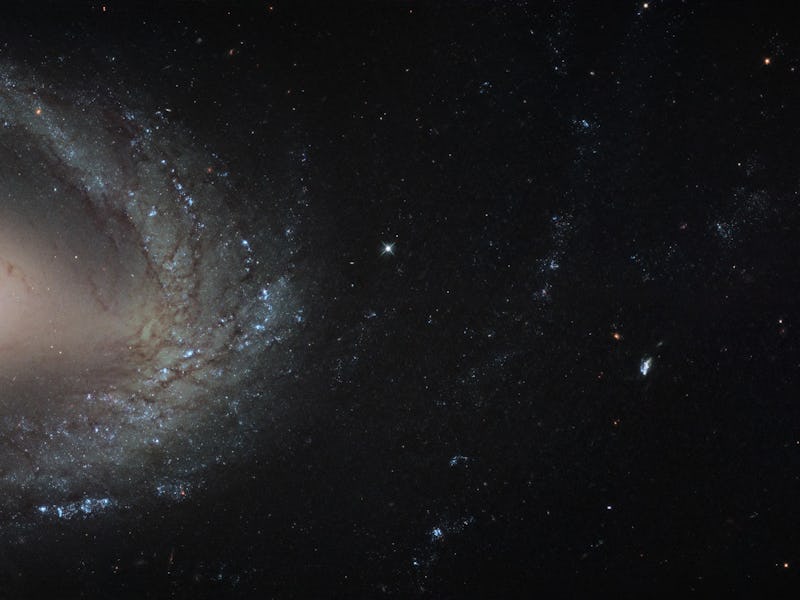 The bigger galaxy also has tendril-like arms protruding from the side and creeping towards NGC 1510. The smaller galaxy’s gravitational interactions have been enough to warp NGC 1512’s cosmic tentacles, but that tidal tug of war has caused NGC 1510’s own star formation to react more intensely — which means the smaller galaxy is also something of a bright blue lamp in a pitch-black forest.