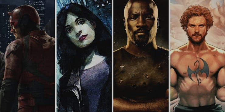 To be fair, The Defenders is nothing new in this regard. Daredevil, Jessica Jones, and the like all were somewhat infamous for their moody, atmospheric opening titles that dragged on for too long. But The Defenders’s intro, which lasts a full minute and ten seconds, is arguably the least interesting visually. Instead of purple-noir paintings like Jessica Jones or bleeding cityscapes like Daredevil, The Defenders offers up high-up views of the Manhattan street grid at night, with color-coordinated overlays of what looks like official promotional art of the four heroes.