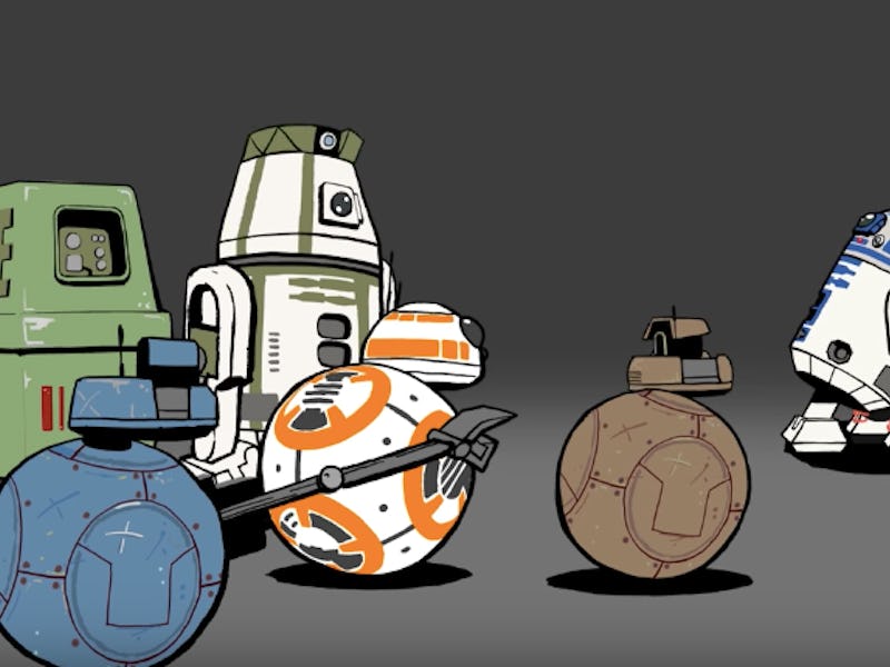“Fan Droids,” released Sunday, shows a group of adoring droids (including the cutest spheric object of all time, BB-8) watching filmed footage of R2D2 as he schools the Galactic Empire in series of robotic hi-jinks.