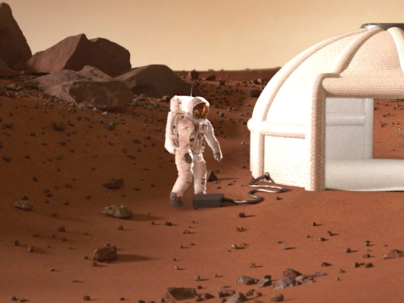 On September 3, as part of the Escape Velocity science and pop culture convention in Washington D.C., Gendel presented his innovative concept for what he is now calling the “Habolith”. Resembling an inflatable igloo in space, Gendel believes the Habolith is the best bet for living on Mars on a budget. Going cheap, in this case, means low-mass and low-volume during the trip out of Earth’s gravity, where costs are estimated at $100,000 per kg of payload mass. As pointed out by Outerplaces, building structures on other planets is extremely difficult because “all that building material has to come from somewhere, along with the tools and equipment to build it.” Material weight is a big obstacle, leading many to believe that one solution around shipping so much stuff to Mars would lie in 3D-printing houses after the fact. But, because 3D printers are so bulky, Gendel felt there was an easier, two-step solution.
