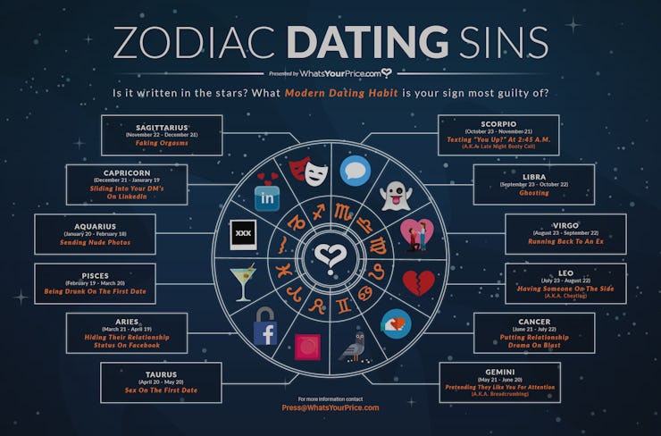 Aside from introducing monetary transactions into the dating world, What’sYourPrice also collects data and presents it in infographics, similar to what dating site OKCupid does on its data analysis blog. On Tuesday, What’sYourPrice released the results of its latest study, in which participants were asked to rank shitty dating habits by the likelihood they’d use them. The site then took those statistics and cross-referenced them with every user’s astrological sign. What resulted is a shiny infographic predicting what terrible thing people are likely to do to someone they’re dating, based on their astrological sign.