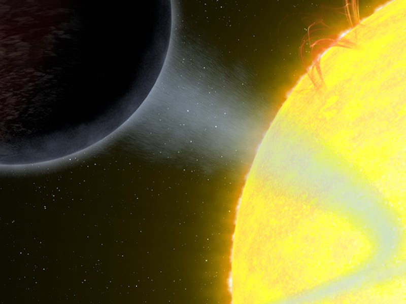 This illustration shows one of the darkest known exoplanets — an alien world as black as fresh asphalt — orbiting a star like our sun.