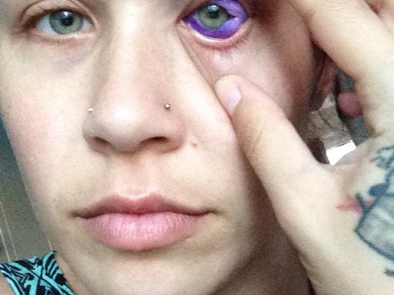 According to Catt Gallinger’s Facebook, the 24-year-old model recently went to have the white of her eyes — known as the sclera — tinted purple. After the procedure, her eyes began to swell and ooze purple sludge from the ink.