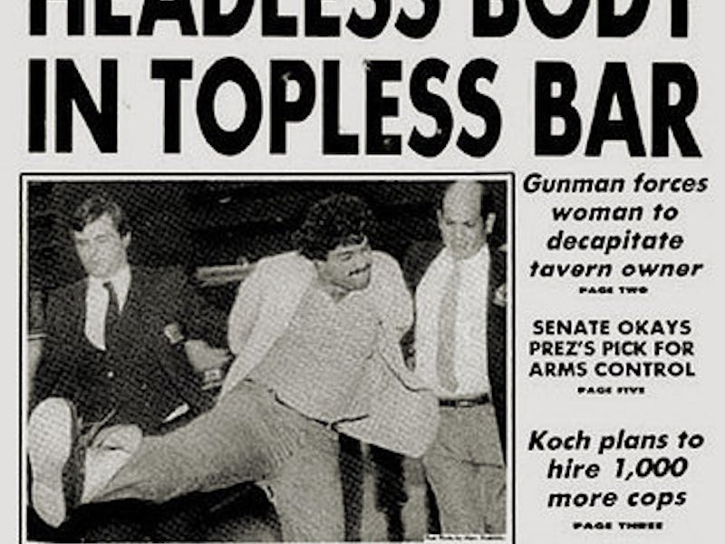 This is an inspired flash of brilliance that might be the only tabloid headline that most Americans can quote. Just look at that jewel. Decapitation, sex, booze, surprise, and straight-faced humor all packed tighter than a hobo’s last cigarette. Those five little words! It makes “For sale. Baby shoes. Never worn.” look like a filibuster. The Pythagorean theorem is flabby by comparison. The true tale of that corpse will never match the one the headline evokes in your imagination. Musetto’s Post colleague would compare the scene that night at the copy desk to an oil painting of the founding fathers huddled around the Declaration of Independence.