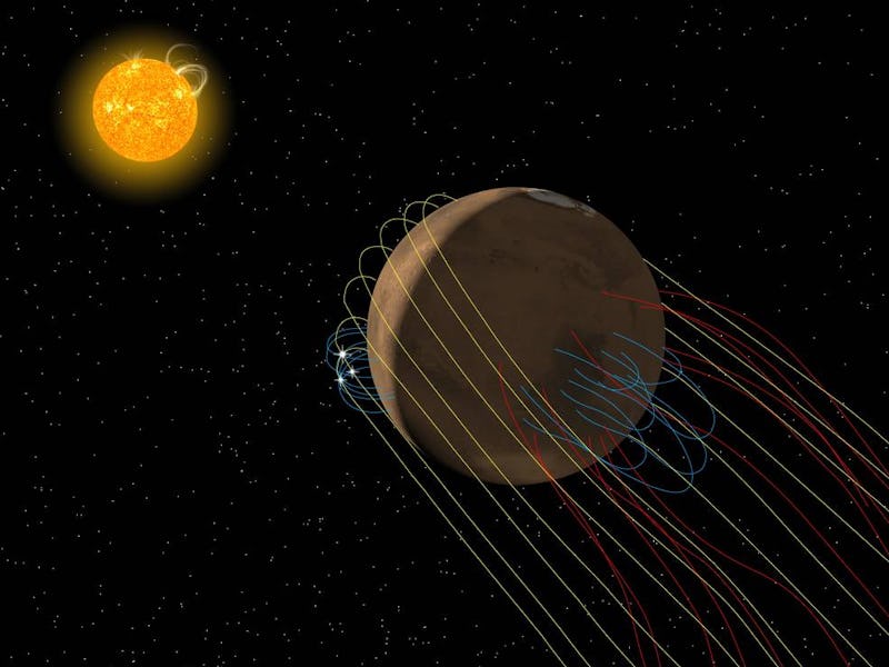 Planets like Earth and Venus are protected from bursts of radiation from the sun by large magnetic fields. While it’s likely that Mars once had a global magnetic field similar to Earth’s, it’s gradually lost it over the course of billions of years. According to a new model created by the MAVEN team, Mars has been left to drag around a “magnetotail,” which is formed by highly charged particles from solar wind connecting with magnetic fields on the planet’s surface. This process, called “magnetic reconnection,” might have actually sent much of Mars’ atmosphere off into space.