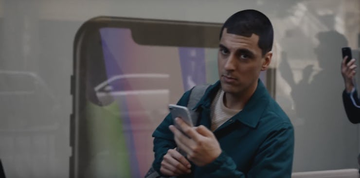 The scene then moves through the years, as the character sees a Samsung Galaxy Note user taking down notes with the included stylus and dropping their phone in water only to use it without issue. The user is then seen struggling with the 3.5mm headphone jack adaptor included with last year’s iPhone 7. The ad ends with the character, now an owner of a Samsung Galaxy, walking past people waiting in line for the iPhone X.