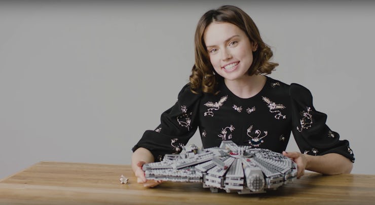 Then, for Elle, Ridley builds a Lego Millennium Falcon — which she completes in five minutes! — during her interview. In it, she reveals that her father has not changed allegiances and is still a massive Star Trek fan. Go figure.