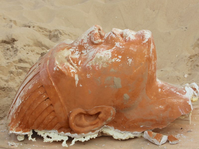 The set pieces are thought to have survived so well because sand allows for drainage; if not for the sand, Jenzen says the relics would “turn to mush.” This newly discovered face measures in at five and a half feet by three feet by eight feet. To get it out of the swimming pool-sized hole it was dug up in, they fastened surfboards to plywood and sledded it out of the dunes.
