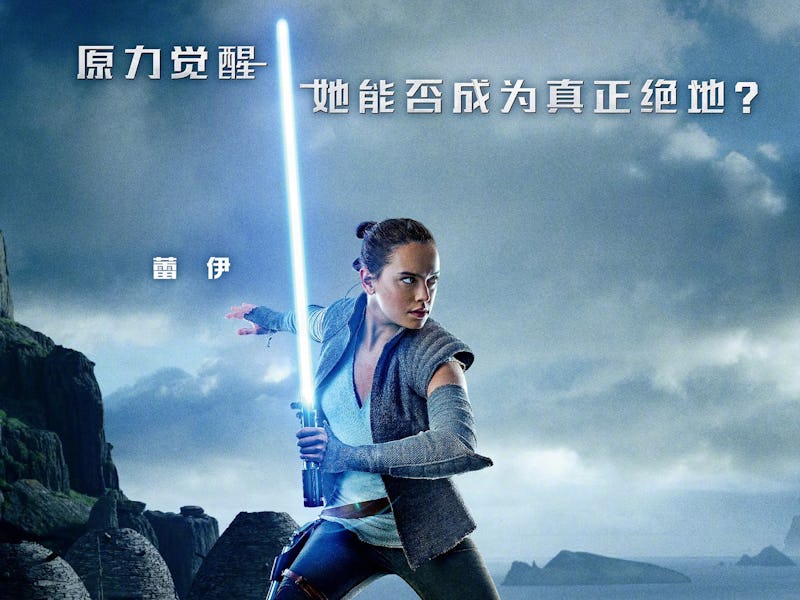 The recently revealed Chinese poster details Rey on Ahch-To in what looks to be the early stages of her Jedi training. In the image, Rey is wearing the exact same outfit that she arrived in at the end of Star Wars: The Force Awakens. And, perhaps more notably than that, she still has the blaster Han Solo gave her strapped to her leg.