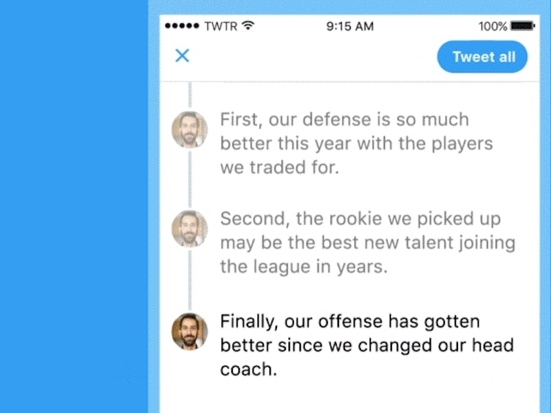 Well, fresh off unleashing the horror of 280 characters, Twitter announced Tuesday it’s not yet done with its efforts to drill all the way down to the bottom circle of internet hell. As explained on its blog, Twitter is rolling out a new feature over the next few weeks designed to make it easier for people to create threads, in which people fail to take the hint of keeping their thoughts to a single tweet and connect a bunch together in a train of thought that defeats the whole theoretical purpose of Twitter’s pithy raison d’être.