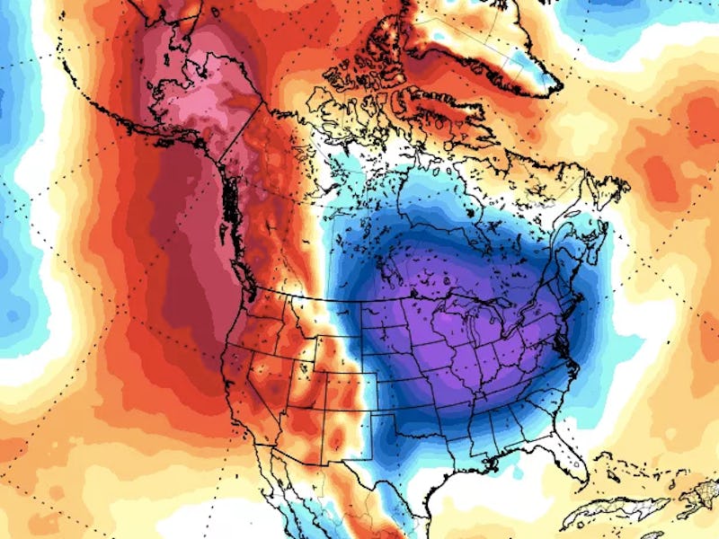 The Dipole is a term used to describe a newish weather phenomenon in North America where we see high temperatures and dry weather in the West (hello, California wildfires) and simultaneous extreme cold in the East. A jet stream, a weather term for a fast-moving air pattern that’s perfect for storms and also divides warm and cold air, moves north in the western half of the nation and then plunges into the Eastern U.S., resulting in the dramatic temperature disparity we see on each end of the country.