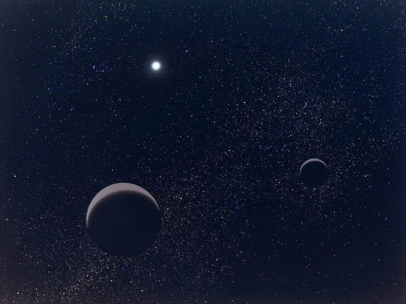 The double planet system describes the orbit of Pluto (which is tiny, at only about 1,470 miles wide), and Charon (which, for a moon, is relatively big — about 12 percent the size of Pluto). The result is a wobbly orbit around a center of gravity which lies not on Pluto but above the dwarf planet’s surface.