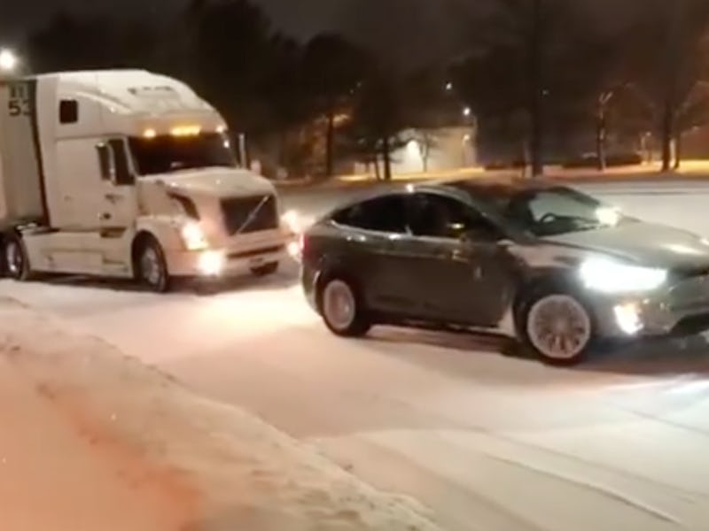The video, shared by Musk via Electrek, showed a truck stuck in Raleigh, North Carolina, on Wednesday, where blistering cold lows of 10 degrees Fahrenheit brought as much as six inches of snow. Model X owner Ben Spreen, filmed by his friend Kyle Connor, pulled the truck up to the top of the incline.