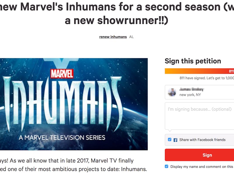 Inhumans was canceled because almost everybody hated it (even Rotten Tomatoes audience score, which is typically much kinder than the critics’ score, was just 51 percent) and the ratings were abysmal. Fewer than 2 million people watched the finale. Those are two very good reasons for a major network to cancel a series, and it’s doubtful that a few hundred jabronis on Change.org are going to make Disney, a company worth tens of billions of dollars, do an about-face.