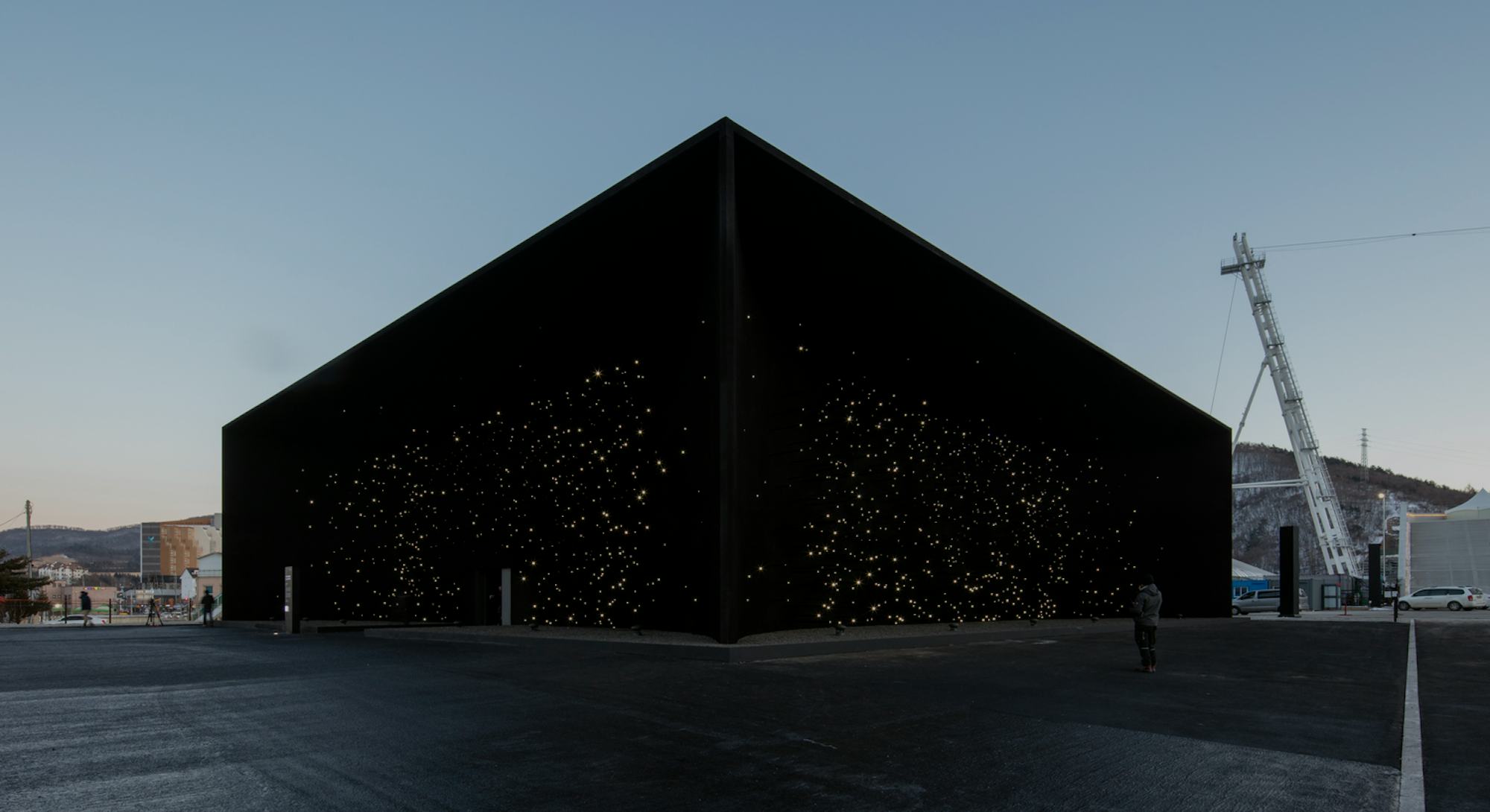 With the 2018 Olympic Games set to officially kick off Friday, London-based architecture firm Asif Khan unveiled their pavilion for the Olympic Plaza, dubbed “the darkest building on Earth.”