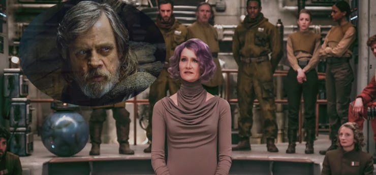 Because Admiral Holdo pilots a giant Resistance ship on a hyperspace suicide mission in a pivotal moment, the character dies before Luke would have had a chance to meet her. When Luke’s living Force ghost appears on the planet Crait to play mind games with Kylo Ren, Holdo is clearly not with them. So why did Mark Hamill and Laura Dern film scenes together?