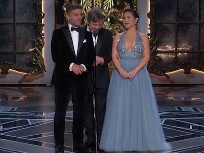 Sunday night at the 90th Academy Awards ceremony, the astromech droid that stole our hearts in Star Wars: The Force Awakens rolled up to the front of the stage at the Dolby Theater to present Best Animated Short Film and Best Feature Film. He did so alongside his Last Jedi co-stars Oscar Isaac, Mark Hamill, and Kelly Marie Tran. Isaac, who plays BB-8’s owner Poe Dameron in the new Star Wars trilogy, might’ve confirmed that the droid spoke Yiddish.