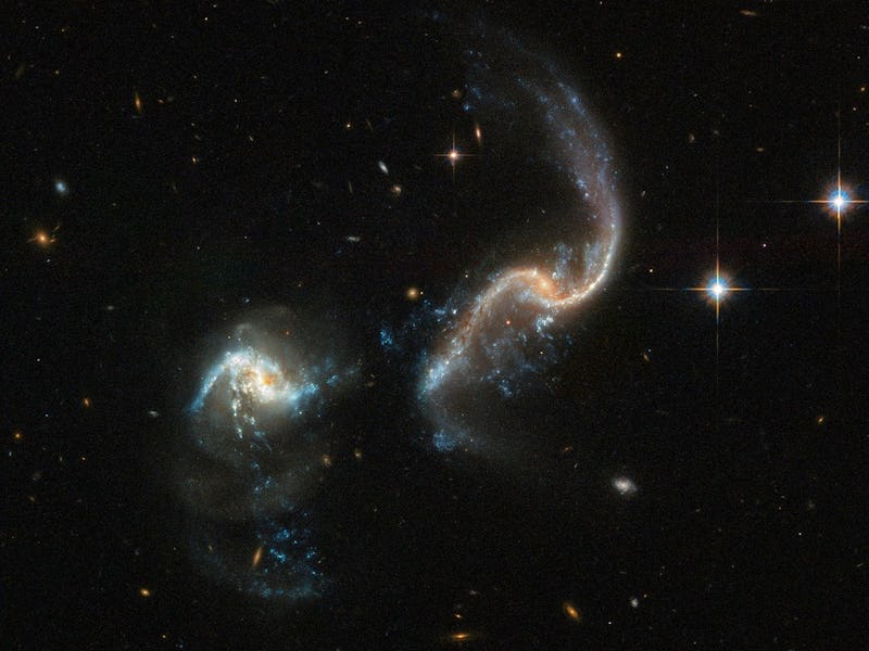 Even though this deep-space tango is just getting started, there is already evidence of this deformation. The galaxy at the top has an extremely pronounced tidal tail — an extended ribbon of gas, dust, and stars.