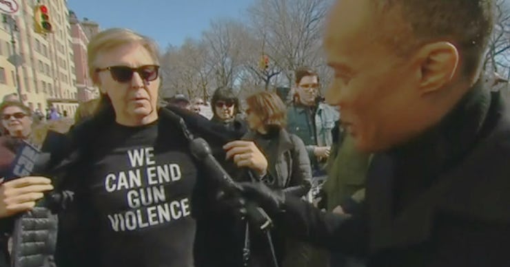 Sir Paul McCartney joined tens of thousands of people who gathered in New York City for the March For Our Lives protest on Saturday. While an estimated 500,000 people joined the central march in Washington, D.C., McCartney opted to march in the city where he lost his friend and Beatles bandmate, John Lennon.
