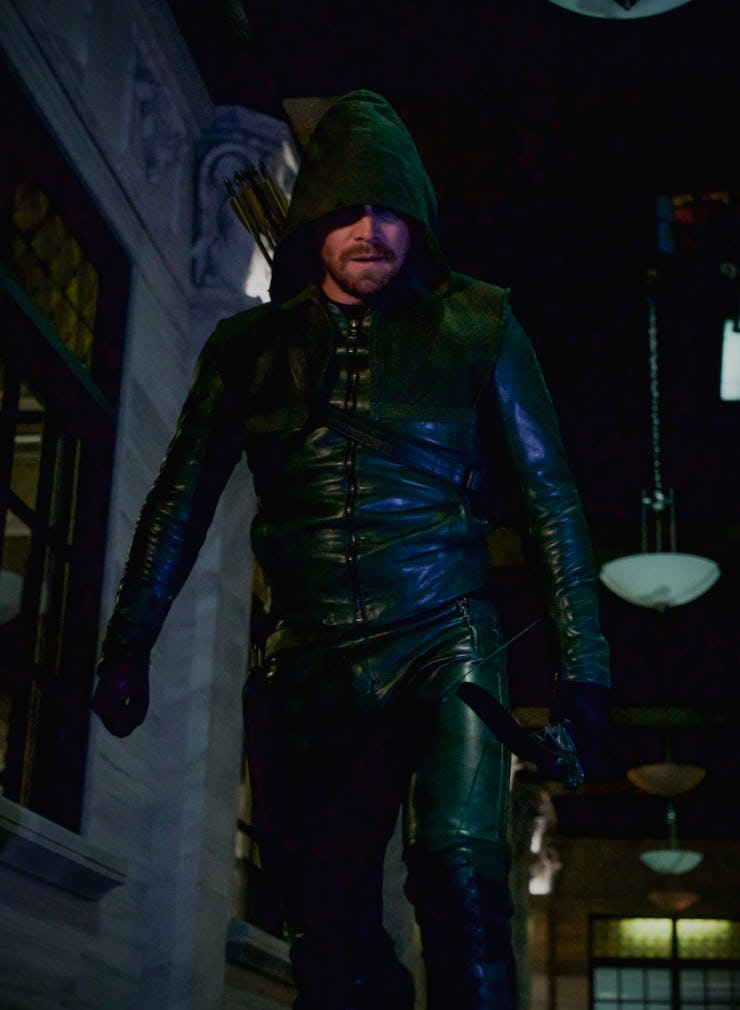 In the current season of Arrow, Oliver Queen wears a tactical uniform as the Green Arrow. But when he was the wanted vigilante known as “The Hood,” Queen wore a modernized version of Robin Hood’s getup. Queen wore that costume until Season 4 of Arrow, where he formally adopted the name “Green Arrow” and wore a new outfit to go with the identity. In Season 5, Felicity added sleeves to give him protection for his sweet biceps.