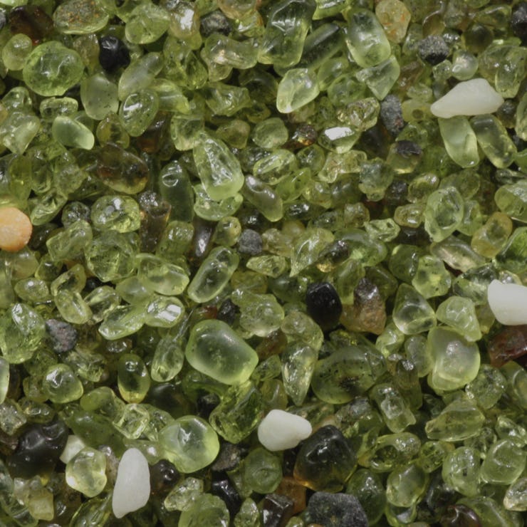 The abundance of olivine minerals in Hawaii, a volcanic archipelago, comes down to the elements swirling around in the magma beneath it. Olivine is made up primarily of magnesium, iron, silicon, and oxygen, and the combination of the latter three creates a class of mineral known as an iron silicate, which is one of the most common types of rock-forming minerals.