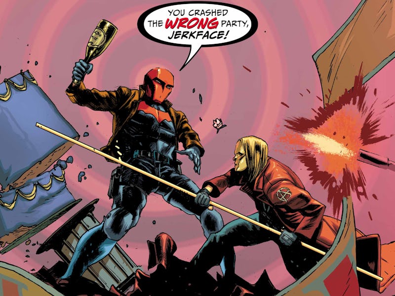From 'Batman: Prelude to the Wedding' #1, where Red Hood fights angry white incels.