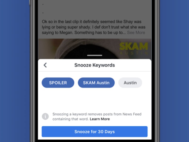 On Wednesday, Facebook announced it would begin testing a new feature called ‘Keyword Snooze,’ which will allow users to “temporarily hide posts by keywords” for 30 days. The feature will apparently be added to the menu that appears when you hit the three little dots on the right-hand corner of News Feed posts.