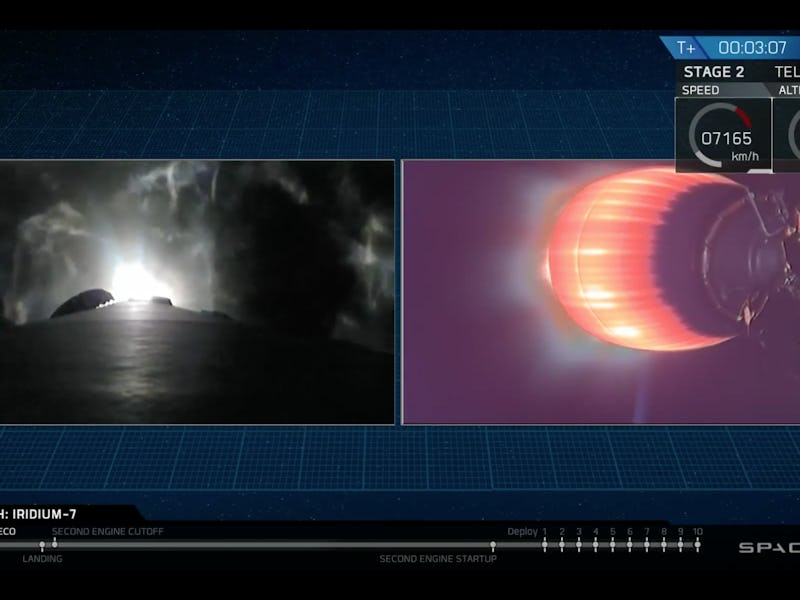 The mission, which took off from Vandenberg Air Force Base in California at 4:39 a.m. Pacific time, sent 10 Iridium NEXT satellites to join the 55 others in orbit, the seventh mission in a tech upgrade that will see SpaceX launch 75 communications satellites in total. John Insprucker, SpaceX principal integration engineer, said during the live webcast that “sea conditions are fairly rough” and “the worst conditions we’ve ever had for trying to get a first stage on a drone ship.” Six minutes after launch, the three Merlin engines illuminated the titanium grip fins as the booster entered entry burn. Just one-and-a-half minutes later, the booster lit the drone ship on the pre-dawn sea before cutting to darkness, having successfully landed.