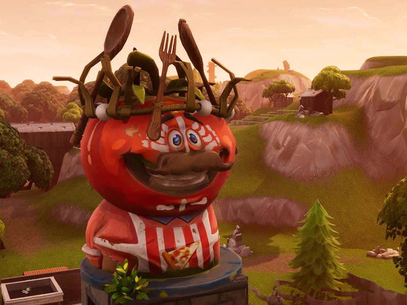Week 8 began on Thursday morning, and the new loading screen features Brite Bomber and a fully-unlocked Drift exploring Tomato Temple with lit torches. On a raised platform in the background is Cuddle Team Leader throwing a tomato at the back of Rex’s head. Per usual, the scene throws in t random character outfits as characters to set a dynamic scene — but somewhere in the mix is a silhouette marking the location players need to visit as part the Road Trip Challenge.
