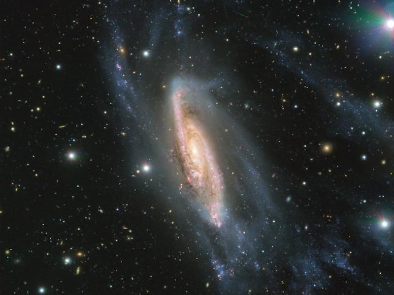 The resplendent center of NGC 3981 is actually a disc of hot, young stars. This is typical of a spiral galaxy, which make up the majority of the bright galaxies we see in our own Milky Way. Further away from the bright-young star center lies older objects, gas, and dust — seen here as the baby blue wisps that surround the galaxy like taffeta. The stretched bits viewed here are likely due to do to the gravitational influence of a long-ago galactic encounter.