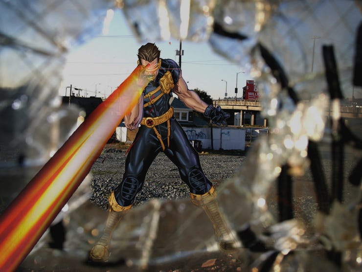 Cyclops possesses the mutant ability to project a beam of concussive, ruby-colored force from his eyes. Cyclops’s eyes are no longer the complex organic jelly that utilizes the visible spectrum of light to see the world around it. Instead, they are inter-dimensional apertures between this universe and another, non-Einsteinium universe, where physical laws as we know them do not pertain. This non-Einsteinium universe is filled with particles that resemble photons, yet they interact with this universe’s particles by transferring kinetic energy in the form of gravitons (the particle of gravitation). These particles generate great, directional concussive force when they interact with the objects of this universe.