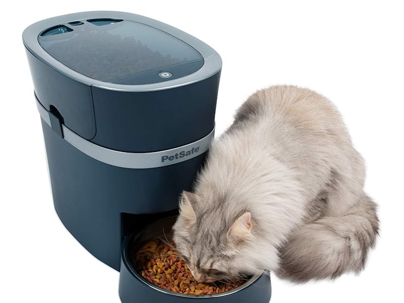 Why We Chose It Use your phone to feed your furry friend when you’re running late, or program up to 12 meals on a schedule. You can set portion sizes and even have the food dispensed slowly over 15 minutes. All the parts of the feeder that get dirty can go through the dishwasher.