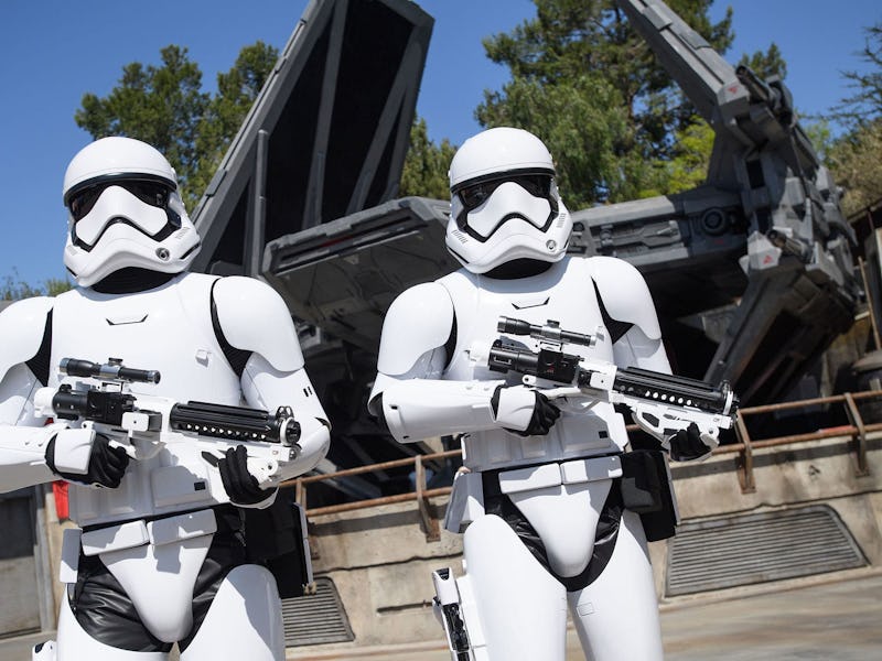 First Order Stormtroopers march around Galaxy's Edge. In the story, the First Order is looking for something, or someone.