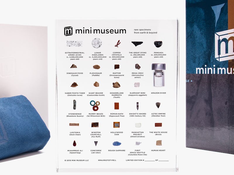 The large version of the Mini Museum contains 29 specimen and measures 5” tall x 4” wide x 1” thick. You might be wondering what this museum actually comprises of. Well, here are some examples: Extraterrestrial Amino Acids (c. 4,568,200,000 years old), mummy beads (c. 1st millennium BCE), a knight’s sword (14th century CE), and even a part of a human heart. Each of these mini museums are put together by hand, and every item is authentic and comes with a certificate of authenticity.