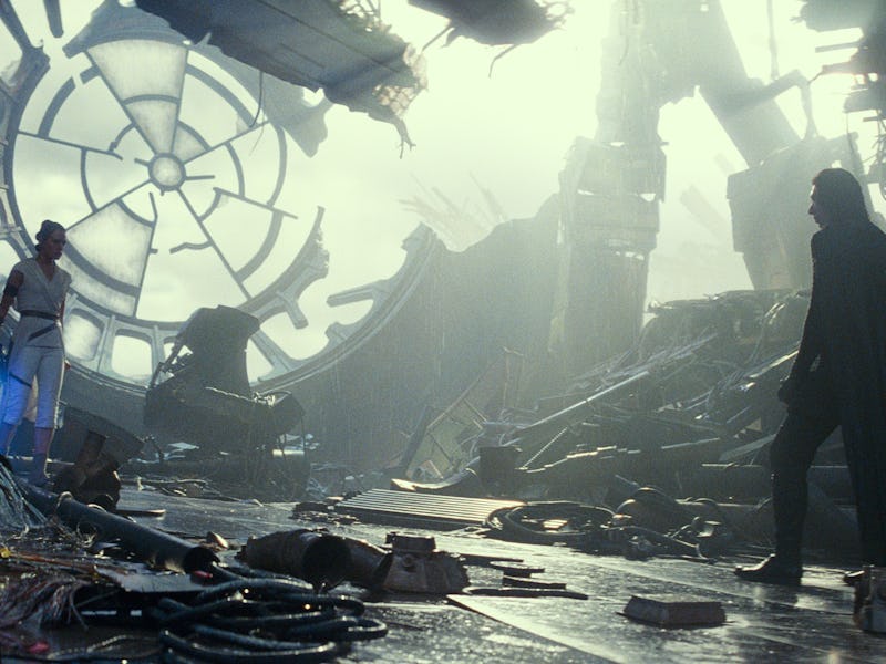 Rey and Kylo’s positions in this shot also recall Luke’s confrontation with Palpatine in a fascinating way. (We’ve embedded the clip below if you want to check out the visual similarities yourself.) Rey’s lightsaber is drawn, her shoulders tensed, and it seems she’s the aggressor of the two. Not only does she have the high ground — never a good thing, particularly if you remember Obi-Wan and Anakin’s duel in Revenge of the Sith — she’s also implicitly taking Palpatine’s place, armed and menacing next to the throne.