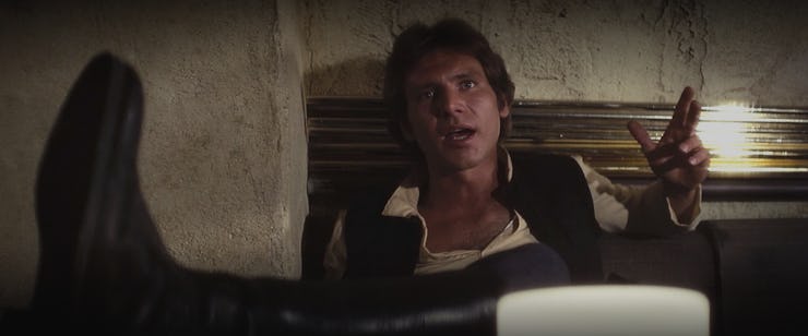 In the original 1977 film released in theaters, Han shoots Greedo under the table — perfectly illustrating the roguish, chaotic neutral alignment of Han and the lawless galaxy that exists under the brutal Empire’s boot.